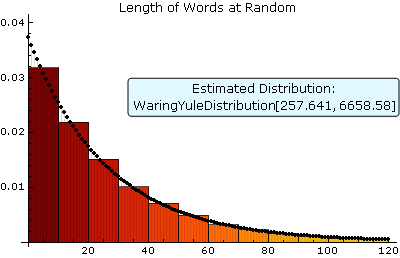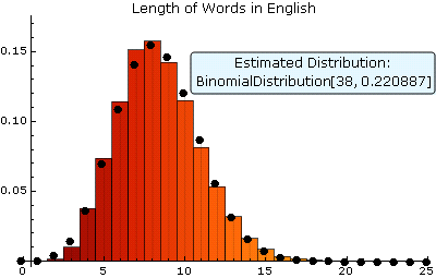 Длина слов английского языка следует биномиальному распределению BinomialDistribution—согласование отображено на первом изображении. Совокупность слов случайной длины можно хорошо моделировать с помощью распределения Юла WaringYuleDistribution, показанном на втором изображении.