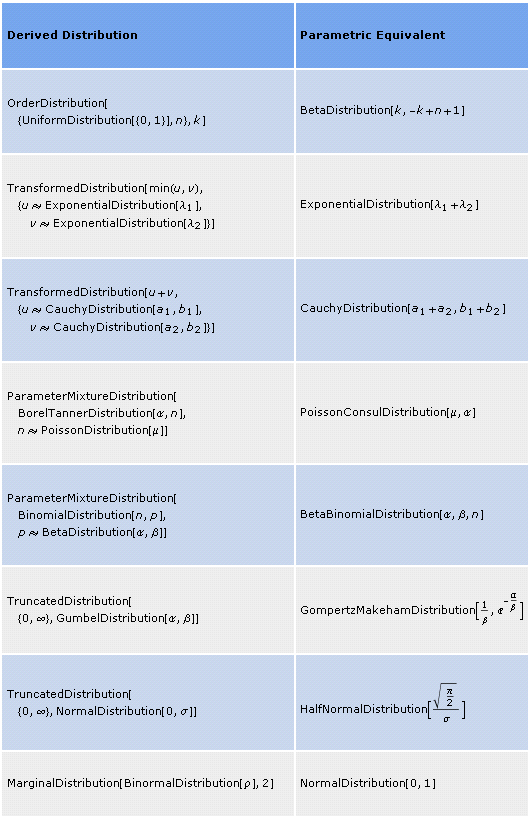 distTable[ Join[{{Style["Derived Distribution", Bold], Style["Parametric Equivalent", Bold]}}, Table[{Extract[dists, i, HoldForm], ReleaseHold[dists[[i]]]}, {i, Length[dists]}]]]