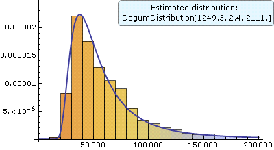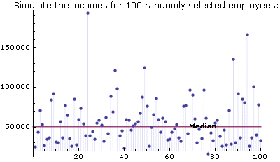 Show[Histogram[salaries, {0, 200000, 10000}, "PDF", ChartStyle -> "BeachColors"], Plot[PDF[TruncatedDistribution[{0, 200000}, edist], x], {x, 0, 200000}, PlotStyle -> Thick], BaseStyle -> {FontFamily -> "Verdana"}, Epilog -> Inset[Framed[ Style[Grid[{{"Estimated distribution: "}, {Round[#, .1] & /@ edist}}], 11], Background -> LightBlue, RoundingRadius -> 3], {Right, Top}, {Right, Top}], ImageSize -> 400] ListPlot[{RandomVariate[edist, 100], Tooltip[{{0, Median[edist]}, {100, Median[edist]}}, "Median"]}, Filling -> {1 -> Axis}, Joined -> {False, True}, AxesOrigin -> {0, 20000}, PlotStyle -> {PointSize[Medium], Thick}, BaseStyle -> {FontFamily -> "Verdana"}, PlotLabel -> "Simulate the incomes for 100 randomly selected employees:", Epilog -> Inset[Style["Median", Bold, 10], {75, Median[edist]}, {Center, Center}], ImageSize -> 400]