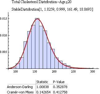 Общий уровень холестерина (мг/дл), измеренный у участников исследования не старше 21 года, хорошо согласуется с устойчивым распределением.