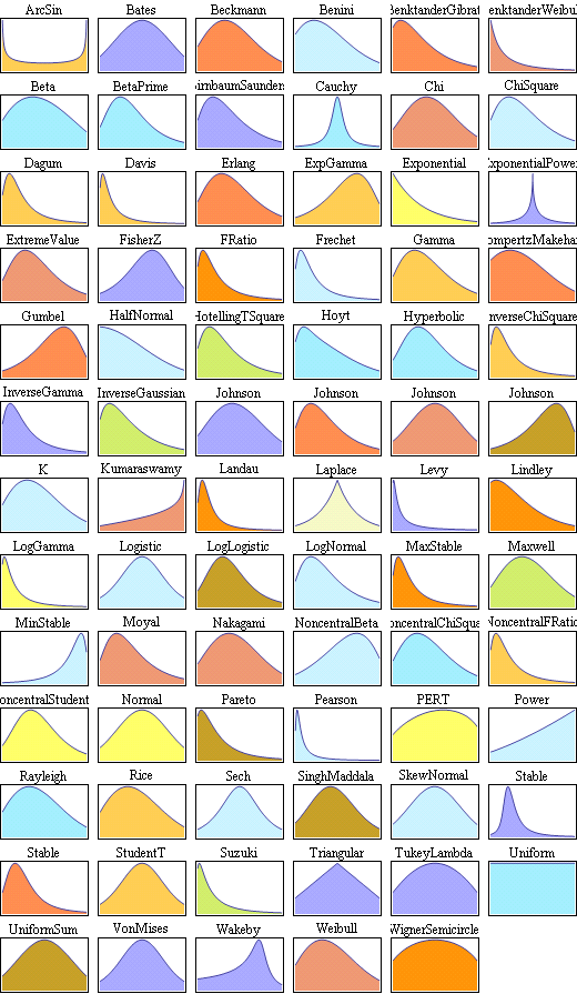 dists = { ArcSinDistribution[{0, 3}], BatesDistribution[4], BeckmannDistribution[1, -2, 2, 3, .3], BeniniDistribution[3, 40, 4], BenktanderGibratDistribution[2, 2], BenktanderWeibullDistribution[0.5, 0.7], BetaDistribution[2, 3], BetaPrimeDistribution[4, 2, 3, 3], BirnbaumSaundersDistribution[1/2, 3], CauchyDistribution[0, 1], ChiDistribution[4], ChiSquareDistribution[6], DagumDistribution[2, 2, 3], DavisDistribution[3, 2.5, 1], ErlangDistribution[5, 1/2], ExpGammaDistribution[1, 2, 1], ExponentialDistribution[2], ExponentialPowerDistribution[1/2, 1, 2], ExtremeValueDistribution[1, 2], FisherZDistribution[1.5, 3], FRatioDistribution[10, 5], FrechetDistribution[2, 1.5], GammaDistribution[4, 2, 1, 0], GompertzMakehamDistribution[2, 1, 0.1, 2], GumbelDistribution[2, 3], HalfNormalDistribution[1], HotellingTSquareDistribution[10, 20], HoytDistribution[.2, .5], HyperbolicDistribution[-2, 2, 1.5, 3, 1], InverseChiSquareDistribution[5, .5], InverseGammaDistribution[2, 2, 1.4, 1], InverseGaussianDistribution[2, 3, 1], JohnsonDistribution["SB", 1, 2, 1.1, 1.5], JohnsonDistribution["SL", 1, 2, 1.1, 1.5], JohnsonDistribution["SN", 1, 2, 1.1, 1.5], JohnsonDistribution["SU", 3, 2, 1.1, 1.5], KDistribution[15, 1], KumaraswamyDistribution[2, 3/4], LandauDistribution[0.5, 1], LaplaceDistribution[2, 0.5], LevyDistribution[0, 4], LindleyDistribution[0.6], LogGammaDistribution[2, 0.5, 1], LogisticDistribution[2, 1], LogLogisticDistribution[5, 1], LogNormalDistribution[1, 1/2], MaxStableDistribution[-1, 2, .5], MaxwellDistribution[1.5], MinStableDistribution[1, 2, .5], MoyalDistribution[1, 1], NakagamiDistribution[3/2, 3], NoncentralBetaDistribution[2, 3, 10], NoncentralChiSquareDistribution[6, 7], NoncentralFRatioDistribution[10, 5, 2, 1], NoncentralStudentTDistribution[7, 2], NormalDistribution[0, 1], ParetoDistribution[3, 2, 3/4, 1], PearsonDistribution[75, -85, 37, 26, 58], PERTDistribution[{-2, 3}, 1, 1], PowerDistribution[1, 2.5], RayleighDistribution[1], RiceDistribution[1, 2, 3], SechDistribution[3, 1], SinghMaddalaDistribution[2, 5, 3], SkewNormalDistribution[0, 2, 0.5], StableDistribution[0, 1, 1/2, 0, 2], StableDistribution[1, 1.3, 1, 0, 2], StudentTDistribution[1, 2, 7], SuzukiDistribution[1/2, 1], TriangularDistribution[{0, 1}, 1/2], TukeyLambdaDistribution[0.4, 1, 0.5], UniformDistribution[{0, 1}], UniformSumDistribution[4, {0, 1}], VonMisesDistribution[0, 2], WakebyDistribution[5, 3, .1, 1/2, 0], WeibullDistribution[2, 2], WignerSemicircleDistribution[0, 2]};