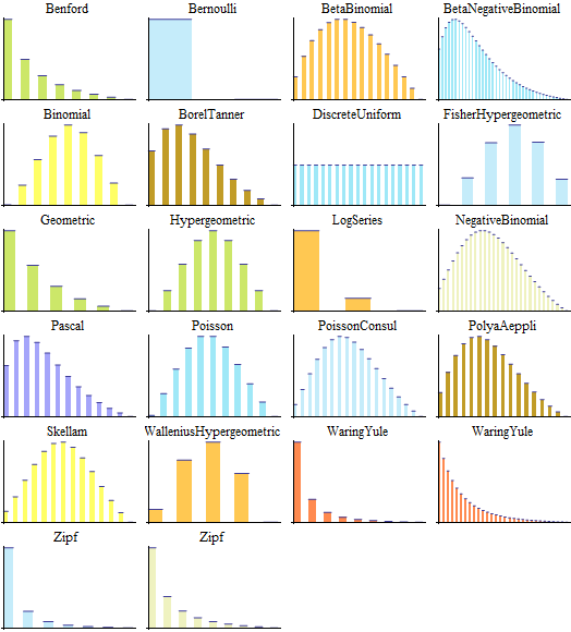 dists = {BenfordDistribution[10], BernoulliDistribution[0.3], BetaBinomialDistribution[2, 3, 20], BetaNegativeBinomialDistribution[6, 4, 20], BinomialDistribution[20, .6], BorelTannerDistribution[.3, 10], DiscreteUniformDistribution[{1, 20}], FisherHypergeometricDistribution[25, 13, 52, 2], GeometricDistribution[.4], HypergeometricDistribution[30, 40, 80], LogSeriesDistribution[.4], NegativeBinomialDistribution[10, .3], PascalDistribution[2, .3], PoissonDistribution[9], PoissonConsulDistribution[9, .3], PolyaAeppliDistribution[4, .5], SkellamDistribution[12, 3], WalleniusHypergeometricDistribution[13, 13, 52, 2], WaringYuleDistribution[1.4], WaringYuleDistribution[3, 16], ZipfDistribution[1.2], ZipfDistribution[10, .2]};
