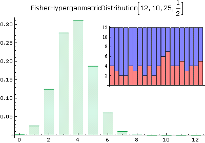 Урна содержит 10 красных шаров единичного веса и 15 синих шаров, имеющих вероятностный вес 2. При независимой выборке 12 шаров, вероятность вытянуть красный или синий шар зависит от его вероятностного веса. Число красных шаров в выборке следует гипергеометрическому распределению Фишера FisherHypergeometricDistribution. Красно-синяя диаграмма показывает симулирование 20 таких выборок.