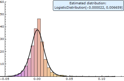 LogisticDistribution brinda un muy buen ajuste para cambios fraccionales de precios de previos precios de cierre de acciones. Use EstimatedDistribution para encontrar el mejor ajuste con distribución logística para los cambios de precios fraccionales diarios del índice de Standard & Poor's 500 desde el 1ro de enero de 2000 al 1ro de enero de 2009. Use esta distribución para ejecutar una simulación.