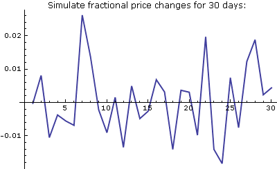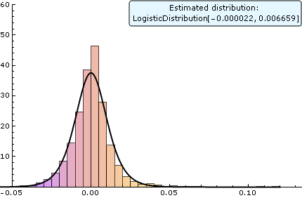 Логистическое распределение LogisticDistribution хорошо согласуется с относительными изменениями цены акций при закрытии биржи относительно вчерашнего её значения. Используется команда EstimatedDistribution для нахождения оптимальных параметров логистического распределения для согласия с данными о дневном относительном изменении индекса Standard & Poor's 500 с 1 января 2000 года по 1 января 2009 года. Найденное распределение используется для построения выборки.