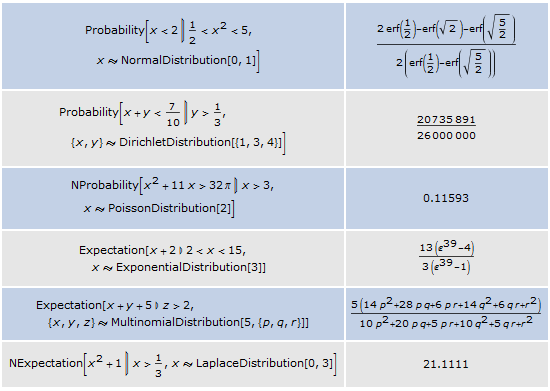 conditionalprobabilitiesandexpectations = {HoldForm[ Probability[x < 2 \[Conditioned] 1/2 < x^2 < 5, x \[Distributed] NormalDistribution[0, 1]]], HoldForm[ Probability[ x + y < 7/10 \[Conditioned] y > 1/3, {x, y} \[Distributed] DirichletDistribution[{1, 3, 4}]]], HoldForm[ NProbability[x^2 + 11 x > 32 Pi \[Conditioned] x > 3, x \[Distributed] PoissonDistribution[2]]], HoldForm[ Expectation[x + 2 \[Conditioned] 2 < x < 15, x \[Distributed] ExponentialDistribution[3]]], HoldForm[ Expectation[ x + y + 5 \[Conditioned] z > 2, {x, y, z} \[Distributed] MultinomialDistribution[5, {p, q, r}]]], HoldForm[ NExpectation[x^2 + 1 \[Conditioned] x > 1/3, x \[Distributed] LaplaceDistribution[0, 3]]]};