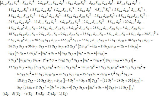 MomentConvert[CentralMoment[{1, 2}] CentralMoment[{2, 1}], "UnbiasedEstimator", PowerSymmetricPolynomial] // FunctionExpand // Simplify // TraditionalForm