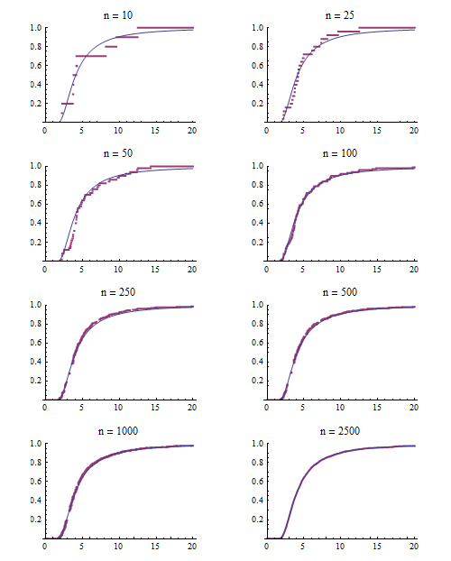data = RandomVariate[FrechetDistribution[2, 3, .5], 2500]; lens = {10, 25, 50, 100, 250, 500, 1000, 2500}; edists = Table[EmpiricalDistribution[Take[data, k]], {k, lens}]; limitplot = Plot[CDF[FrechetDistribution[2, 3, .5], x], {x, 0, 20}];