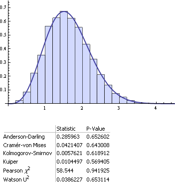 vals = RandomVariate[NakagamiDistribution[2, 3], 10^4]; h = DistributionFitTest[vals, NakagamiDistribution[\[Mu], \[Omega]], "HypothesisTestData"]; Row[{Show[Histogram[vals, 25, "PDF"], Plot[PDF[h["FittedDistribution"], x], {x, 0, 5}, PlotStyle -> Thick]], h[{"TestDataTable", All}]}]