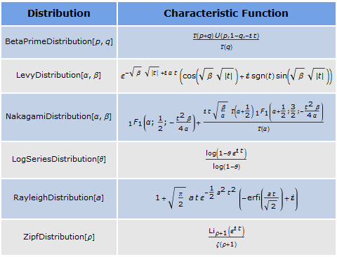 distTable[ Join[{{Style["Distribution", Bold, 14], Style["Characteristic Function", Bold, 14]}}, Table[{dists[[i]], CharacteristicFunction[dists[[i]], t]}, {i, Length[dists]}]]]