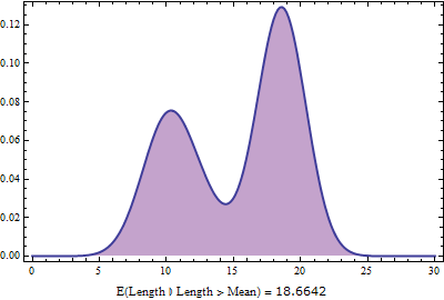 Labeled[Plot[PDF[\[ScriptCapitalD], x], {x, 0, 30}, PlotStyle -> Thick, Filling -> Axis, FillingStyle -> Hue[.8, .2, .8], Frame -> True, ImageSize -> 400], Style[Row[{Text[ "E(\!\(\*FormBox[\(Length \[Conditioned] Length > Mean\), TraditionalForm]\))"], expected}, "="], FontFamily -> "Verdana"]]