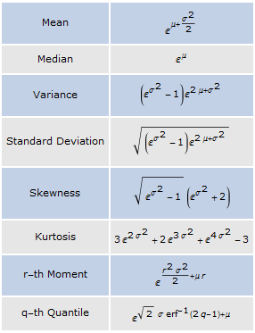 distTable[funs@LogNormalDistribution[\[Mu], \[Sigma]]]