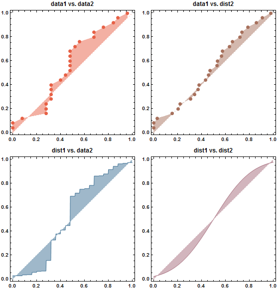 Grid[Partition[ MapThread[ ProbabilityPlot[# /. HoldForm -> Identity, #2 /. HoldForm -> Identity, ImageSize -> 275, ImagePadding -> {{20, 5}, {20, 5}}, AspectRatio -> 1, PlotStyle -> Directive[PointSize[Large], #3], Filling -> {2 -> {1}}, FillingStyle -> Directive[Thick, Lighter[#3, 0.5]], ReferenceLineStyle -> Directive[Dotted, Thick, Lighter[#3, 0.5]], PlotLabel -> Row[{#, " vs. ", #2}], BaseStyle -> {FontFamily -> "Helvetica"}, LabelStyle -> Bold] &, {{HoldForm[data1], HoldForm[data1], HoldForm[dist1], HoldForm[dist1]}, {HoldForm[data2], HoldForm[dist2], HoldForm[data2], HoldForm[dist2]}, ColorData[28] /@ {1, 3, 7, 9}}], 2]]