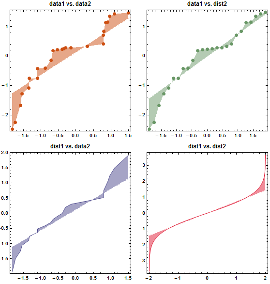 Grid[Partition[ MapThread[ QuantilePlot[# /. HoldForm -> Identity, #2 /. HoldForm -> Identity, ImageSize -> 275, ImagePadding -> {{20, 5}, {20, 5}}, AspectRatio -> 1, PlotStyle -> Directive[PointSize[Large], #3], Filling -> {2 -> {1}}, FillingStyle -> Directive[Thick, Lighter[#3, 0.5]], ReferenceLineStyle -> Directive[Dotted, Thick, Lighter[#3, 0.5]], PlotLabel -> Row[{#, " vs. ", #2}], LabelStyle -> Bold, BaseStyle -> {FontFamily -> "Helvetica"}] &, {{HoldForm[data1], HoldForm[data1], HoldForm[dist1], HoldForm[dist1]}, {HoldForm[data2], HoldForm[dist2], HoldForm[data2], HoldForm[dist2]}, ColorData[35] /@ {1, 5, 7, 9}}], 2]]