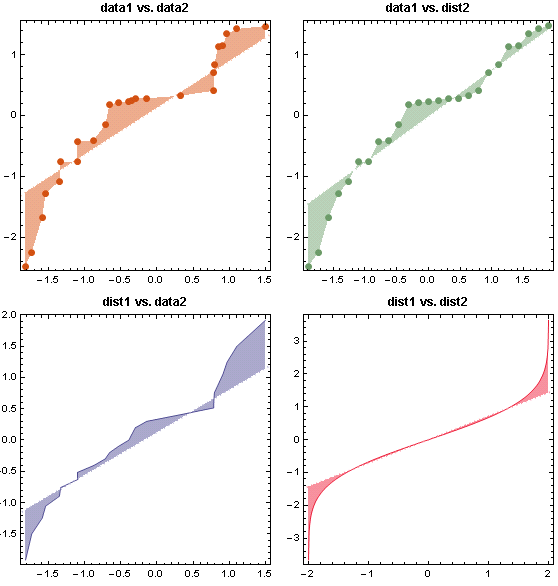 Grid[Partition[ MapThread[ QuantilePlot[# /. HoldForm -> Identity, #2 /. HoldForm -> Identity, ImageSize -> 275, ImagePadding -> {{20, 5}, {20, 5}}, AspectRatio -> 1, PlotStyle -> Directive[PointSize[Large], #3], Filling -> {2 -> {1}}, FillingStyle -> Directive[Thick, Lighter[#3, 0.5]], ReferenceLineStyle -> Directive[Dotted, Thick, Lighter[#3, 0.5]], PlotLabel -> Row[{#, " vs. ", #2}], LabelStyle -> Bold, BaseStyle -> {FontFamily -> "Helvetica"}] &, {{HoldForm[data1], HoldForm[data1], HoldForm[dist1], HoldForm[dist1]}, {HoldForm[data2], HoldForm[dist2], HoldForm[data2], HoldForm[dist2]}, ColorData[35] /@ {1, 5, 7, 9}}], 2]]