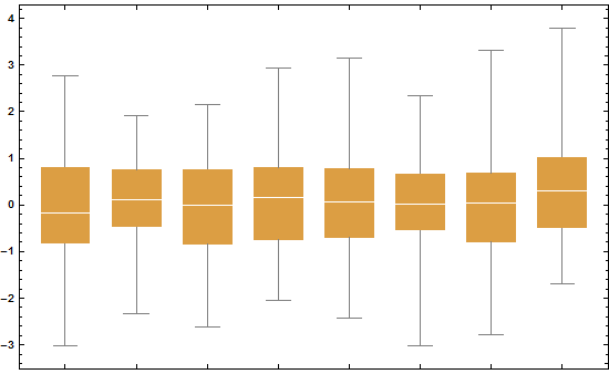 BoxWhiskerChart[ Table[RandomVariate[NormalDistribution[0, 1], 100], {8}], ImageSize -> 550, ChartStyle -> ColorData[17, 4], BaseStyle -> {FontFamily -> "Helvetica"}, LabelStyle -> Bold]