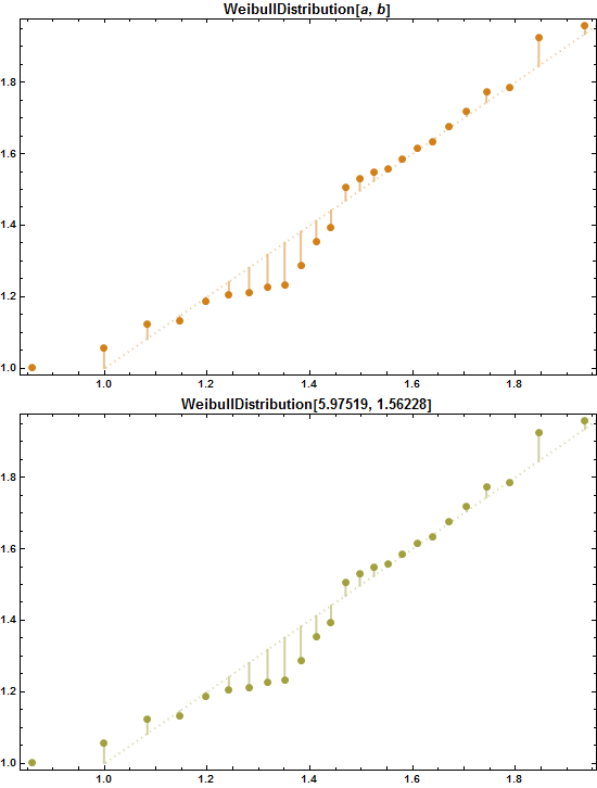 Column[MapThread[ QuantilePlot[data, # /. HoldForm -> Identity, Filling -> Automatic, ImageSize -> 550, PlotLabel -> Style[#, FontSize -> 13], FillingStyle -> Directive[Thick, Lighter[#2, 0.5]], ReferenceLineStyle -> Directive[Dotted, Thick, Lighter[#2, 0.5]], PlotStyle -> Directive[PointSize[Large], #2], Method -> {"ReferenceLineMethod" -> "Reference"}, BaseStyle -> {FontFamily -> "Helvetica"}, LabelStyle -> {Bold}] &, {{WeibullDistribution[a, b], EstimatedDistribution[data, WeibullDistribution[a, b]]}, ColorData[5] /@ {6, 10}}]]