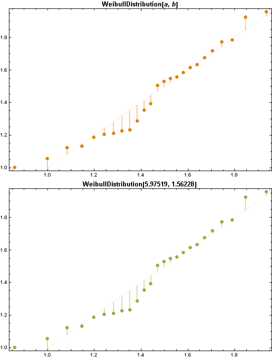Column[MapThread[ QuantilePlot[data, # /. HoldForm -> Identity, Filling -> Automatic, ImageSize -> 550, PlotLabel -> Style[#, FontSize -> 13], FillingStyle -> Directive[Thick, Lighter[#2, 0.5]], ReferenceLineStyle -> Directive[Dotted, Thick, Lighter[#2, 0.5]], PlotStyle -> Directive[PointSize[Large], #2], Method -> {"ReferenceLineMethod" -> "Reference"}, BaseStyle -> {FontFamily -> "Helvetica"}, LabelStyle -> {Bold}] &, {{WeibullDistribution[a, b], EstimatedDistribution[data, WeibullDistribution[a, b]]}, ColorData[5] /@ {6, 10}}]]