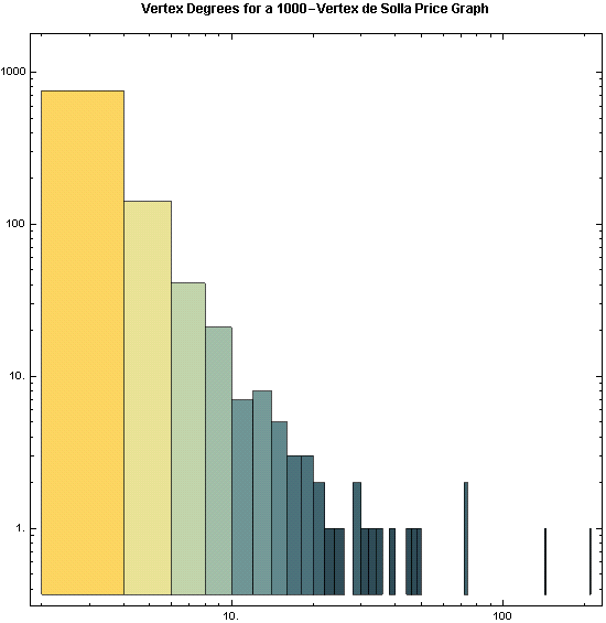 Histogram[data, ScalingFunctions -> {"Log", "Log"}, Frame -> True, ColorFunction -> "StarryNightColors", AspectRatio -> 1, ImageSize -> 550, LabelStyle -> Bold, PlotLabel -> "Vertex Degrees for a 1000-Vertex de Solla Price Graph", BaseStyle -> {FontFamily -> "Helvetica"}]
