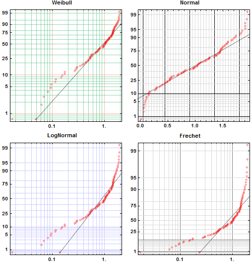 Create normal probability plots, Weibull plots, log-normal probability plots, exponential probability plots, Frechet plots, Gumbel plots, and Rayleigh plots by plotting data on axes that are scaled to linearize the respective distributions.