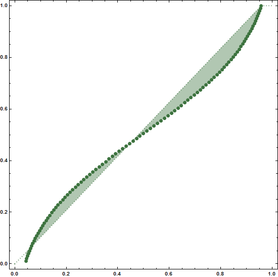 ProbabilityPlot[Range[0, 10, 0.1], PlotStyle -> Directive[PointSize[Large], ColorData[17, 7]], ReferenceLineStyle -> Thick, AspectRatio -> 1, Filling -> {2 -> {{1}, Opacity[0.4, ColorData[17, 7]]}}, BaseStyle -> {FontFamily -> "Helvetica"}, ImageSize -> 550, LabelStyle -> Bold]