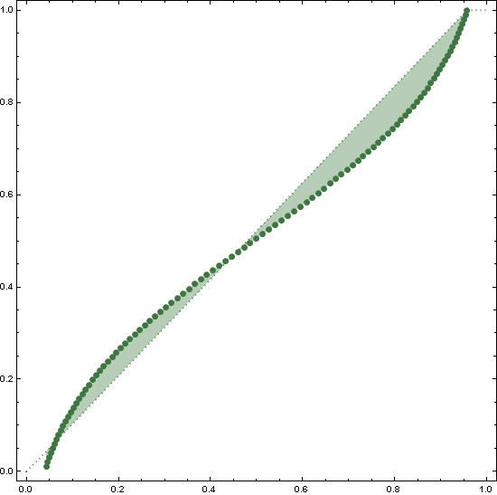 ProbabilityPlot[Range[0, 10, 0.1], PlotStyle -> Directive[PointSize[Large], ColorData[17, 7]], ReferenceLineStyle -> Thick, AspectRatio -> 1, Filling -> {2 -> {{1}, Opacity[0.4, ColorData[17, 7]]}}, BaseStyle -> {FontFamily -> "Helvetica"}, ImageSize -> 550, LabelStyle -> Bold]