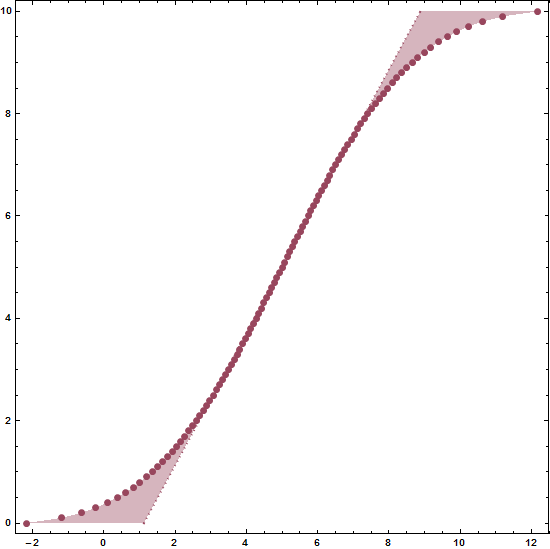 QuantilePlot[Range[0, 10, 0.1], PlotStyle -> Directive[PointSize[Large], ColorData[13, 10]], ReferenceLineStyle -> Thick, AspectRatio -> 1, Filling -> {2 -> {{1}, Opacity[0.4, ColorData[13, 10]]}}, BaseStyle -> {FontFamily -> "Helvetica"}, ImageSize -> 550, LabelStyle -> Bold]