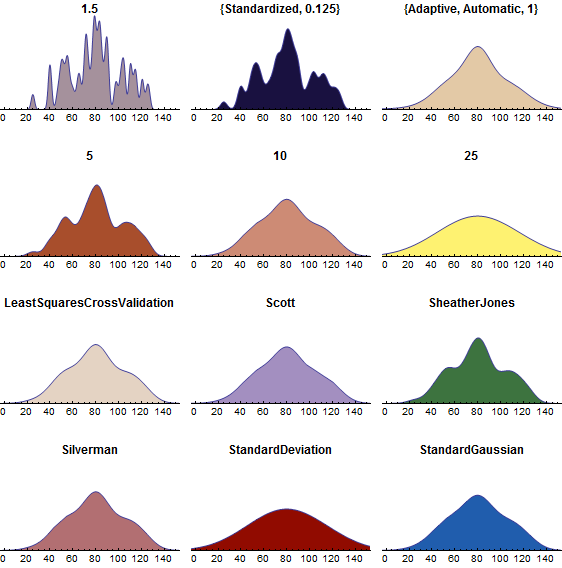 snow = ExampleData[{"Statistics", "BuffaloSnow"}]; Grid[ Partition[ MapThread[ SmoothHistogram[snow, #, PlotRange -> {{0, 150}, {0, .03}}, Axes -> {True, False}, Filling -> {1 -> {0, #2}}, Epilog -> Inset[Style[#, Black, Medium, Bold], Scaled[{.5, .92}]], BaseStyle -> {FontFamily -> "Helvetica"}] &, {Join[{1.5, {"Standardized", 1/8.}, {"Adaptive", Automatic, 1}, 5, 10, 25}, {"LeastSquaresCrossValidation", "Scott", "SheatherJones", "Silverman", "StandardDeviation", "StandardGaussian"}], Table[ColorData[cd, cd], {cd, 9, 20}]}], 3], Spacings -> {1, 2}]