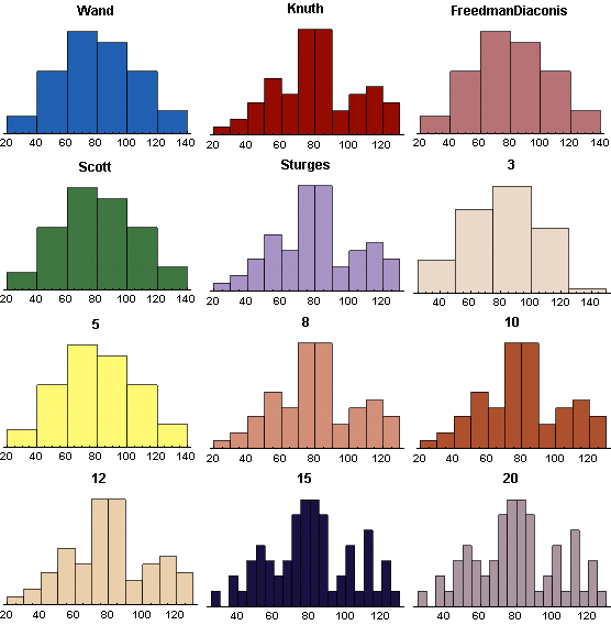 snow = ExampleData[{"Statistics", "BuffaloSnow"}]; Grid[ Partition[ Reverse@MapThread[ Histogram[snow, #, ChartStyle -> #2, PlotRange -> All, PlotLabel -> #, Axes -> {True, False}, BaseStyle -> {FontFamily -> "Helvetica"}, LabelStyle -> Bold] &, {Join[{20, 15, 12, 10, 8, 5, 3}, {"Sturges", "Scott", "FreedmanDiaconis", "Knuth", "Wand"}], Table[ColorData[cd, cd], {cd, 9, 20}]}], 3]]