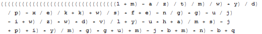 Needs["SymbolicC`"] letters = CharacterRange["a", "z"]; Nest[COperator[ RandomChoice[{Plus, Minus, Times, Divide}], {#, RandomChoice[letters]}] &, 1, 50] // ToCCodeString