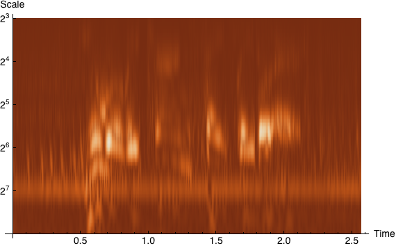 cwd = ContinuousWaveletTransform[snd, GaborWavelet[6], {Automatic, 12}]