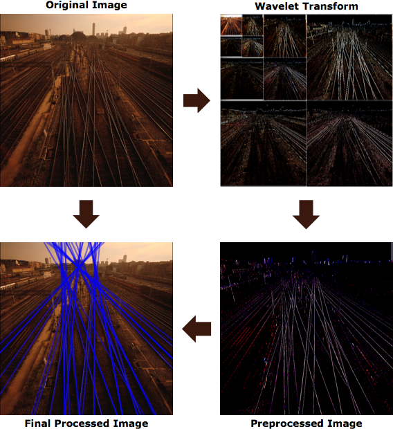 Grid[{{Labeled[Image[img, ImageSize -> 250], Style["Original Image", sty], Top], \!\(\* GraphicsBox[ {Thickness[0.05263157894736842], FaceForm[{RGBColor[ 0.228595, 0.0948806, 0.0555581], Opacity[1.]}], FilledCurveBox[{{{0, 2, 0}, {0, 1, 0}, {0, 1, 0}, {0, 1, 0}, { 0, 1, 0}, {0, 1, 0}}}, {{{9.9999, 18.}, {9.9999, 13.5}, {-0.00009999999999976694, 13.5}, {-0.00009999999999976694, 4.5}, {9.9999, 4.5}, {9.9999, 0.}, {18.9999, 9.}}}]}, AspectRatio->Automatic, ImageSize->{63., 37.}, PlotRange->{{0., 19.}, {0., 18.}}]\), Labeled[Image[wimg, ImageSize -> 250], Style["Wavelet Transform", sty], Top]}, {Rotate[\!\(\* GraphicsBox[ {Thickness[0.05263157894736842], FaceForm[{RGBColor[ 0.228595, 0.0948806, 0.0555581], Opacity[1.]}], FilledCurveBox[{{{0, 2, 0}, {0, 1, 0}, {0, 1, 0}, {0, 1, 0}, { 0, 1, 0}, {0, 1, 0}}}, {{{9.9999, 18.}, {9.9999, 13.5}, {-0.00009999999999976694, 13.5}, {-0.00009999999999976694, 4.5}, {9.9999, 4.5}, { 9.9999, 0.}, {18.9999, 9.}}}]}, AspectRatio->Automatic, ImageSize->{66., 39.}, PlotRange->{{0., 19.}, {0., 18.}}]\), -(\[Pi]/2)], "", \!\(\*RotationBox[\* GraphicsBox[ {Thickness[0.05263157894736842], FaceForm[{RGBColor[ 0.228595, 0.0948806, 0.0555581], Opacity[1.]}], FilledCurveBox[{{{0, 2, 0}, {0, 1, 0}, {0, 1, 0}, {0, 1, 0}, {0, 1, 0}, {0, 1, 0}}}, {{{9.9999, 18.}, {9.9999, 13.5}, {-0.00009999999999976694, 13.5}, {-0.00009999999999976694, 4.5}, {9.9999, 4.5}, {9.9999, 0.}, {18.9999, 9.}}}]}, AspectRatio->Automatic, ImageSize->{70., 40.000000000000284`}, PlotRange->{{0., 19.}, {0., 18.}}], BoxRotation->-1.5707963267948966`]\)}, {Labeled[ Image[fimg, ImageSize -> 250], Style["Final Processed Image", sty], Bottom], \!\(\*RotationBox[\* GraphicsBox[ {Thickness[0.05263157894736842], FaceForm[{RGBColor[ 0.228595, 0.0948806, 0.0555581], Opacity[1.]}], FilledCurveBox[{{{0, 2, 0}, {0, 1, 0}, {0, 1, 0}, {0, 1, 0}, {0, 1, 0}, {0, 1, 0}}}, {{{9.9999, 18.}, {9.9999, 13.5}, {-0.00009999999999976694, 13.5}, {-0.00009999999999976694, 4.5}, {9.9999, 4.5}, {9.9999, 0.}, {18.9999, 9.}}}]}, AspectRatio->Automatic, ImageSize->{68., 40.}, PlotRange->{{0., 19.}, {0., 18.}}], BoxRotation->3.141592653589793]\), Labeled[Image[preimg, ImageSize -> 250], Style["Preprocessed Image", sty], Bottom]}}, Spacings -> 0]