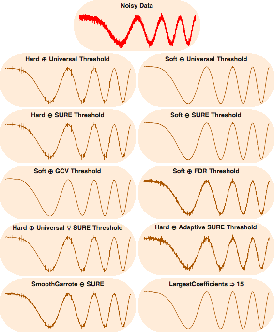 methods = {"Hard \[CirclePlus] Universal Threshold", "Soft \[CirclePlus] Universal Threshold", "Hard \[CirclePlus] SURE Threshold", "Soft \[CirclePlus] SURE Threshold", "Soft \[CirclePlus] GCV Threshold", "Soft \[CirclePlus] FDR Threshold", "Hard \[CirclePlus] Universal \[LightBulb] SURE Threshold", "Hard \[CirclePlus] Adaptive SURE Threshold", "SmoothGarrote \[CirclePlus] SURE", "LargestCoefficients \[DoubleRightArrow] 15"};