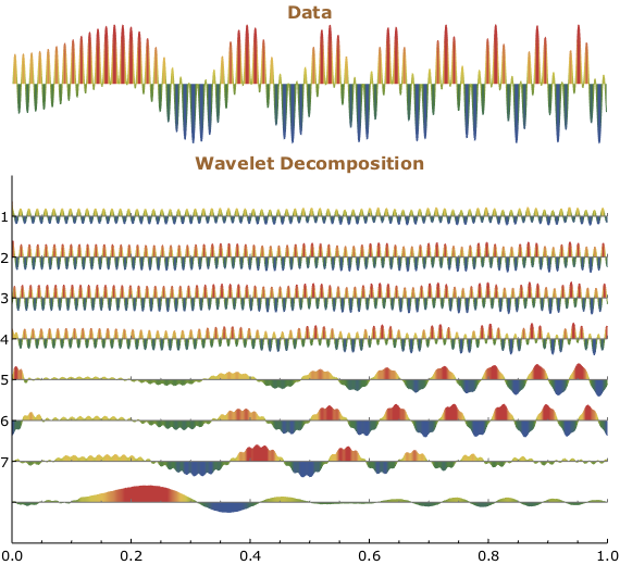 Column[{ListLinePlot[data, ImageSize -> 570, AspectRatio -> 0.2, Axes -> None, ColorFunction -> "DarkRainbow", Filling -> Axis, PlotLabel -> Style["Data", FontFamily -> "Verdana", Brown, Bold, 16], InterpolationOrder -> 2], WaveletListPlot[dwd, DataRange -> {0, 1}, ColorFunction -> "DarkRainbow", Filling -> Axis, ImageSize -> 570, PlotRangePadding -> None, TicksStyle -> Directive[13, FontFamily -> "Verdana"], PlotLabel -> Style["Wavelet Decomposition", FontFamily -> "Verdana", Brown, Bold, 16]]}]