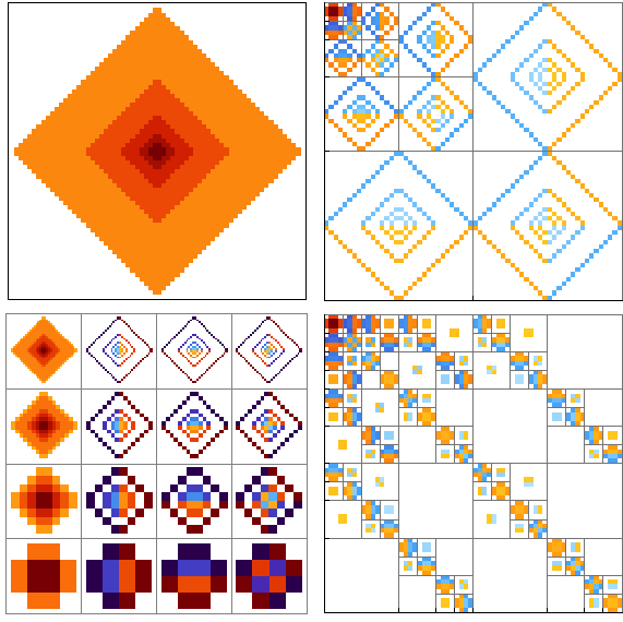n = 64; cf = Function[x, Which[0.48 < x < 0.52, White, x < 0.5, ColorData["DeepSeaColors", 2 x], True, ColorData["SolarColors", Rescale[x, {0.5, 1}, {1, 0}]]]]; mat = Sum[k DiamondMatrix[k, {n, n}], {k, {2, 4, 8, 16, 32}}]; dwd = DiscreteWaveletTransform[mat, Automatic, 4]; dwd2 = WaveletBestBasis[ DiscreteWaveletPacketTransform[mat, Automatic, 4]]; Grid[{{MatrixPlot[mat, FrameTicks -> None, ImageSize -> 275, ColorFunction -> cf, ImagePadding -> 1], WaveletMatrixPlot[dwd, ImageSize -> 275, Frame -> None, PlotRangePadding -> None, ImagePadding -> 1, ColorFunction -> cf]}, {WaveletMatrixPlot[dwd, PlotLayout -> "Grid", Axes -> None, ImageSize -> 64, ColorFunction -> cf], WaveletMatrixPlot[dwd2, ImageSize -> 275, Frame -> None, PlotRangePadding -> None, ColorFunction -> cf, ImagePadding -> 1]}}]