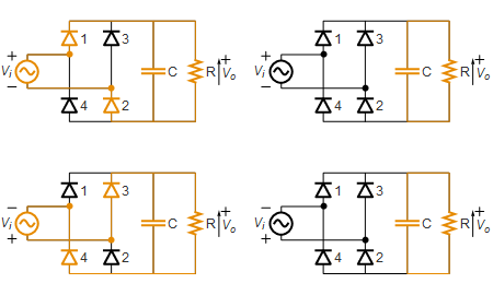 Моделирование двухполупериодного выпрямителя переменного тока в постоянный ток с помощью четырёх диодов и ёмкости для сглаживания выходного сигнала.