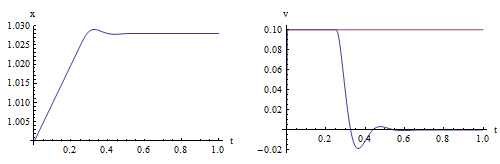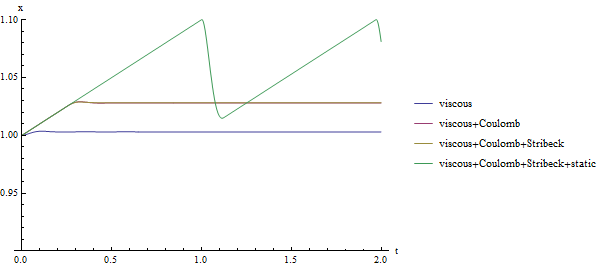 . Сравнение координат и скоростей бруска для различных моделей. Вышестоящая анимация показывает окончательное уточнение модели, включающее четыре типа трения: вязкое трение, Кулоново трение, трение Страйбека и статическое трение.![]() X |