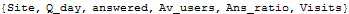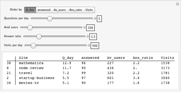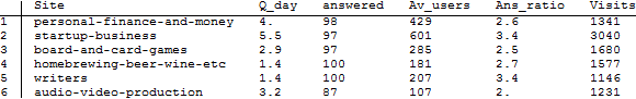 Each row contains the name of the site, average number of questions per day, percentage of answered questions, number of avid users, average ratio of answers to questions, and average number of daily visits.