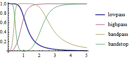 Plot[{Abs[lowpass[I x]], Abs[highpass[I x]], Abs[bandpass[I x]], Abs[bandstop[I x]]}, {x, 0, 5}, PlotRange -> All, PlotStyle -> {Thick, Automatic, Automatic, Automatic}, PlotLegends -> {"lowpass", "highpass", "bandpass", "bandstop"}]