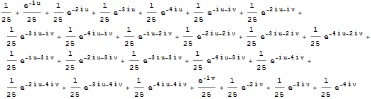 H[u_, v_] = ListFourierSequenceTransform[1/25 \!\(\* TagBox[ RowBox[{"(", "", GridBox[{ {"1", "1", "1", "1", "1"}, {"1", "1", "1", "1", "1"}, {"1", "1", "1", "1", "1"}, {"1", "1", "1", "1", "1"}, {"1", "1", "1", "1", "1"} }, GridBoxAlignment->{ "Columns" -> {{Center}}, "ColumnsIndexed" -> {}, "Rows" -> {{Baseline}}, "RowsIndexed" -> {}, "Items" -> {}, "ItemsIndexed" -> {}}, GridBoxSpacings->{"Columns" -> { Offset[0.27999999999999997`], { Offset[0.7]}, Offset[0.27999999999999997`]}, "ColumnsIndexed" -> {}, "Rows" -> { Offset[0.2], { Offset[0.4]}, Offset[0.2]}, "RowsIndexed" -> {}, "Items" -> {}, "ItemsIndexed" -> {}}], "", ")"}], Function[BoxForm`e$, MatrixForm[BoxForm`e$]]]\), {u, v}]