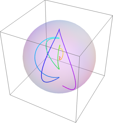 A plot of the curve inside the unit sphere. Notice the coloring, which indicates it starts quite slowly and then speeds up as it gets closer to the surface: