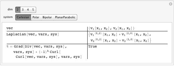 Manipulate[ If[Not@MemberQ[systems[[dim - 1]], system], system = "Cartesian"]; Block[{vars = Array[Subscript[x, #] &, dim], k = dim, vec, lap}, Grid[Transpose[{labels, {vec = Array[Subscript[v, #] @@ vars &, k], lap = (Laplacian[vec, vars, system] // Simplify), Simplify[ lap == Grad[Div[vec, vars, system], vars, system] + (-1)^k Curl[Curl[vec, vars, system], vars, system]]}}], Dividers -> Center, ItemSize -> {{20, 20}, Automatic}, Alignment -> Left]], {dim, Range[2, 5]}, {{system, "Cartesian"}, systems[[dim - 1]], ControlType -> SetterBar}, SaveDefinitions -> True]