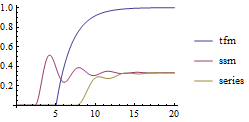 Plot[Evaluate[ Table[OutputResponse[sys, UnitStep[t], {t, 0, 20}], {sys, {tfm, ssm, series}}]], {t, 0, 20}, PlotLegends -> {"tfm", "ssm", "series"}]