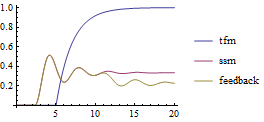 Plot[Evaluate[ Table[OutputResponse[sys, UnitStep[t], {t, 0, 20}], {sys, {tfm, ssm, feedback}}]], {t, 0, 20}, PlotLegends -> {"tfm", "ssm", "feedback"}]