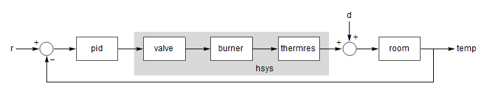 {valve, burner, thermres, room} = {TransferFunctionModel[Unevaluated[{{1/(1 + 4 s)}}], s, SamplingPeriod ->None, SystemsModelLabels -> {{None}, {None}}], TransferFunctionModel[Unevaluated[{{5}}], s, SamplingPeriod ->None, SystemsModelLabels -> {{None}, {None}}], TransferFunctionModel[Unevaluated[{{0.1}}], s, SamplingPeriod ->None, SystemsModelLabels -> {{None}, {None}}], TransferFunctionModel[Unevaluated[{{1/(1 + 8 s)}}], s, SamplingPeriod ->None, SystemsModelLabels -> {{None}, {None}}]};