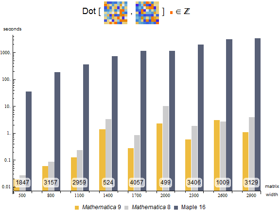 На следующей диаграмме приведены результаты измерения времени нахождения скалярного произведения квадратных целочисленных плотных матриц. Эксперимент производился на 24-ядерной Intel Xeon 3.07 GHz 64-битной Linux системе, с ограничением по времени в 3600 секунд. Число, расположенное внизу, указывает во сколько раз система Mathematica 9 быстрее, чем Maple 16.