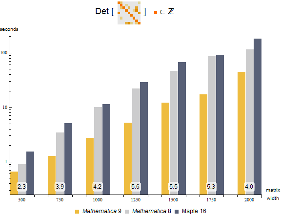 На следующей диаграмме приведены результаты измерения времени нахождения определителя квадратных целочисленных разрежённых матриц. Эксперимент производился на 24-ядерной Intel Xeon 3.07 GHz 64-битной Linux системе, с ограничением по времени в 3600 секунд. Число, расположенное внизу, указывает во сколько раз система Mathematica 9 быстрее, чем Maple 16.