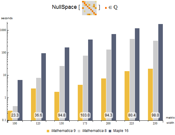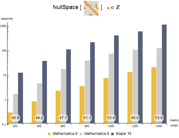 На следующей диаграмме приведены результаты измерения времени нахождения ядра квадратных целочисленных разрежённых матриц. Эксперимент производился на 24-ядерной Intel Xeon 3.07 GHz 64-битной Linux системе, с ограничением по времени в 3600 секунд. Число, расположенное внизу, указывает во сколько раз система Mathematica 9 быстрее, чем Maple 16.