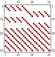 Зададим матрицу размерности 32×32 с символьными матричными элементами, присланную пользователем системы Mathematica. Нахождение определителя этой матрицы занимало более двух суток на компьютере с большим количеством оперативной памяти. Теперь, эта операция занимает не более 100 миллисекунд на обычном компьютере.