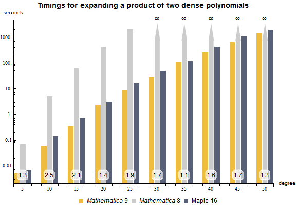от четырёх переменных, с целочисленными коэффициентами размером в 100-бит. Эксперимент производился на 24-ядерной Intel Xeon 3.07 GHz 64-битной Linux системе, с ограничением по времени в 3600 секунд. Число, расположенное внизу, указывает во сколько раз система Mathematica 9 быстрее, чем Maple 16.![]() |
